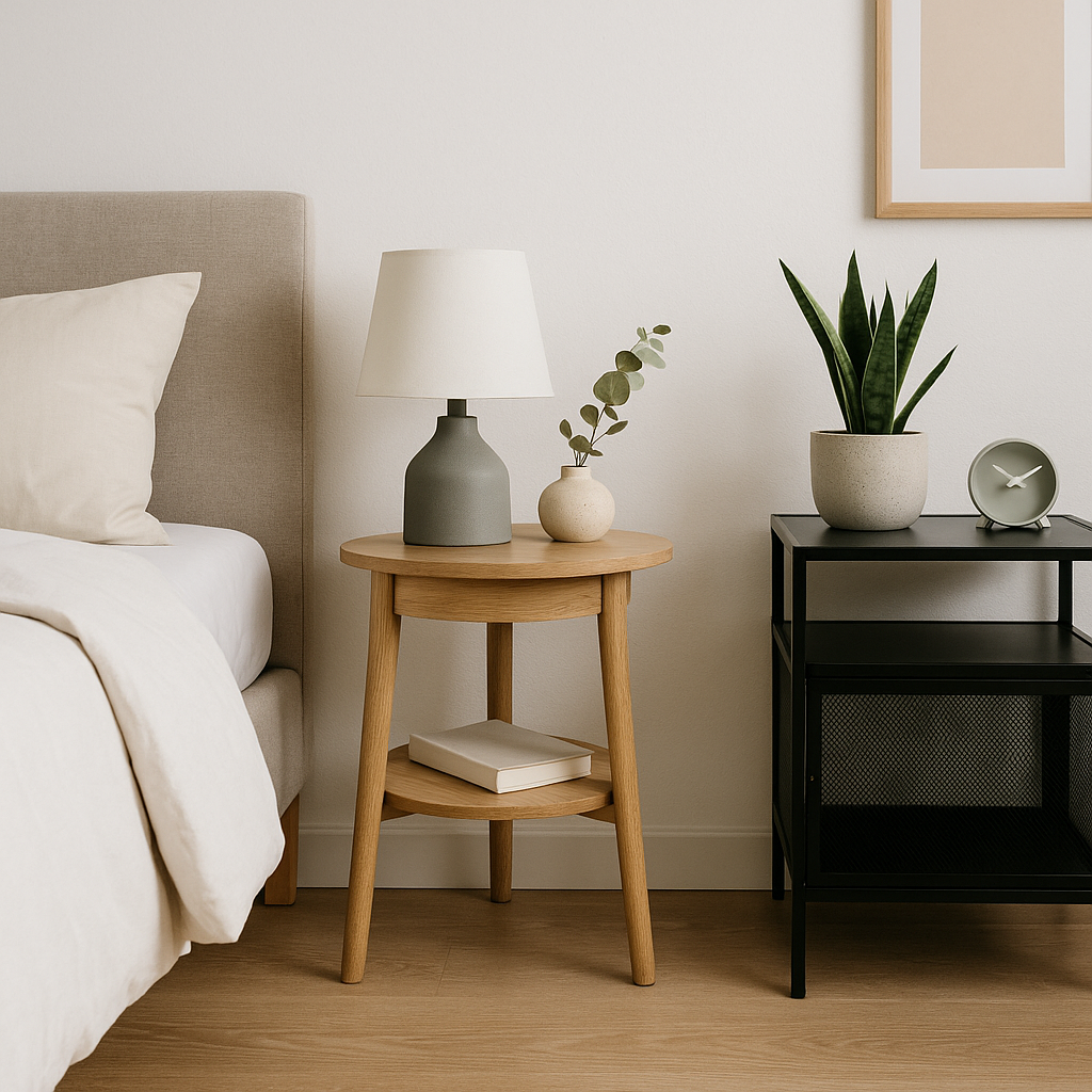 Zapomeň na uniformní sety z katalogů. Dnes je trendem mít noční stolky, které nejsou nutně stejné – každý z nich může mít jiný tvar, barvu i materiál. Jediná podmínka? Měly by spolu ladit alespoň stylově nebo výškou.
